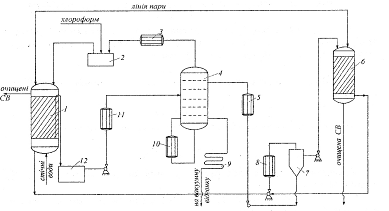 Стічна вода, що містить органічні домішки, надходить в адсорбційний фільтр 1. Після використання адсорбційної ємності адсорбенту залишки води з адсорбенту скидають за допомогою відповідного трубопроводу в збірник неочищених стічних вод. Потім з ємкості 2 у колону подають розчинник-хлороформ. Після повного заповнення шару адсорбенту, що регенерується хлороформом, розчинник зливається через переливний пристрій у ємкість 12. Звідси хлороформ, що містить вилучені з активованого вугілля сполуки, подається в теплообмінник 11, де підігрівається до температури кипіння, і далі у ректифікаційну колону 4. Пара хлороформу через верхню частину колони потрапляє в конденсатор 3 і далі в ємкість 2, а потім знову на адсорбент, який регенерується. Отже за час регенерування адсорбент багато разів промивають чистим хлороформом. Органічні речовини, які вилучаються з води вугіллям, концентруються в кубовий рідині ректифікаційної колони. Кубова рідина після охолодження в охолоднику 9 надходить на вакуумну відгонку ізобутанолу.