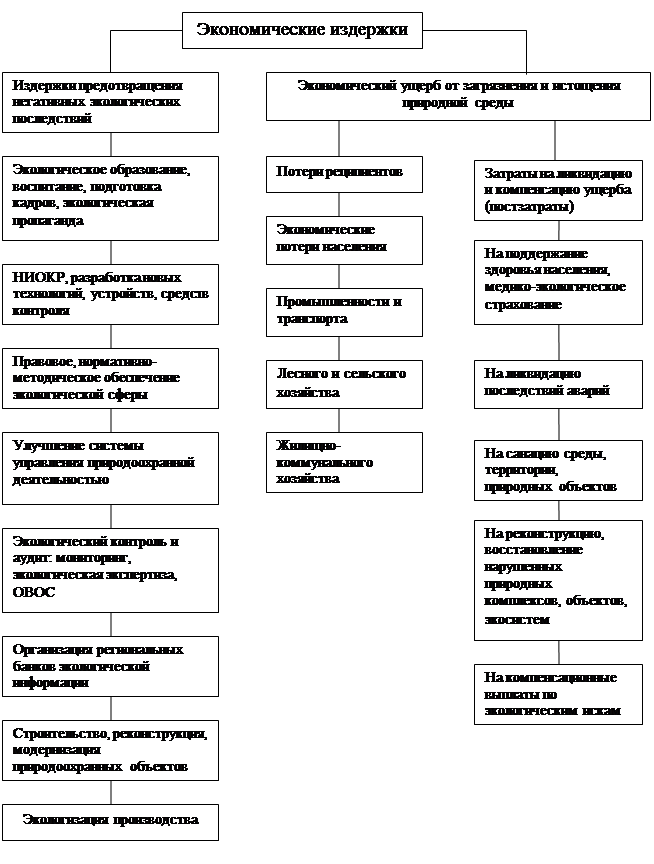 Осуществление природоохранной деятельности, направленной на поддержание качества среды обитания и защиту природы, требует все возрастающих общественных затрат. Все природоохранные затраты по их экономической сущности можно подразделить на издержки предотвращения (предзатраты) и экономический ущерб, включающий прямые потери ресурсов природы и затраты на ликвидацию, нейтрализацию и компенсацию уже допущенных экологических нарушений (постзатраты) (рис.1.).