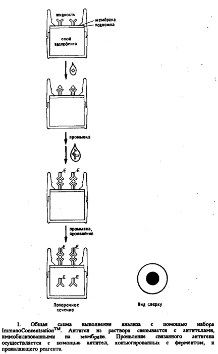 Иммунофильтрация. Под иммунофильтрацией понимают определение вещества методом иммуноанализа после его выделения из пробы фильтрацией через полупроницаемую мембрану. В наиболее простом варианте антиген удерживается мембраной неспецифически, только благодаря определенному размеру ее пор. Далее его определяют с помощью конъюгата фермент – антитело. Этот метод использован для определения ассоциатов вирусов с клетками, однако он не применим к растворимым антигенам или свободным вирусам. В этом случае необходимый антиген специфически связывают с антителами на мембране.