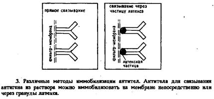 В литературе описано несколько других вариантов метода иммунофильтрации. В одном из них антитела иммобилизуют не непосредственно на мембране, а на гранулах, расположенных на поверхности или внутри мембраны (рис. 3). Гранулы с иммобилизованными антителами могут быть помещены на фильтр заранее или непосредственно перед проведением анализа. Преимуществом последнего варианта является возможность смешивания и подбора различных реагентов и фильтров.