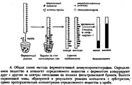 Ферментативная иммунохроматография также потенциально может широко применяться для диагностики на дому и в кабинете врача. Этот метод предназначен для определения гаптенов, которые в настоящее время в основном определяют с помощью конкурентных методов иммуноанализа. Ферментативная иммунохроматография напоминает иммуноанализ с ферментативным усилением, однако между ними есть и существенные отличия.