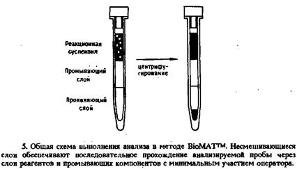В типичном гетерогенном анализе самый верхний слой содержит связанные с антителами гранулы, предварительно смешанные с ферментным конъюгатом. Гранулы диаметром несколько микрометров позволяют значительно ускорить реакцию антиген – антитело по сравнению с трубками или гранулами больших размеров. Реакцию начинают, вводя пробу в анализатор через самоуплотняющуюся мембрану. После инкубации для обеспечения специфического связывания анализатор недолго центрифугируют, заставляя гранулы пройти через не смешивающийся с водой слой. На этой стадии от гранул отделяется несвязавшийся конъюгат. Далее гранулы попадают в нижний слой, содержащий проявляющий для данной ферментной метки раствор. Появление цвета наблюдается только в нижней части пробирки. Интенсивность окраски можно оценить визуально или с помощью специального колориметра. Стадия центрифугирования занимает не более 1 мин, а все необходимые для анализа реагенты находятся уже в пробирке. В анализатор добавляют только изучаемую пробу. В принципе возможен и внутренний контроль, если в анализатор ввести гранулы, с которыми связано определяемое вещество, причем плотность этих гранул должна отличаться от плотности гранул с антителами. Тогда после центрифугирования на другой высоте появится еще одна окрашенная полоса.