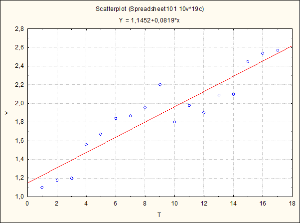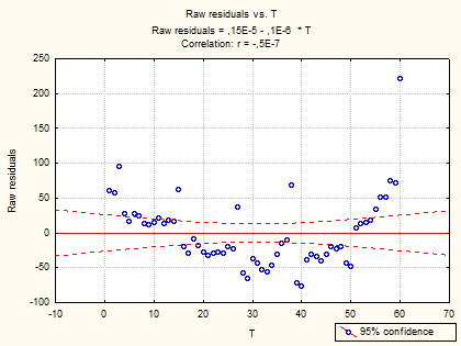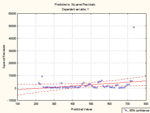 Из графика видно, что линия дисперсий остатков не параллельна оси Х, наклон идет вверх, дисперсия случайного возмущения увеличивается.
