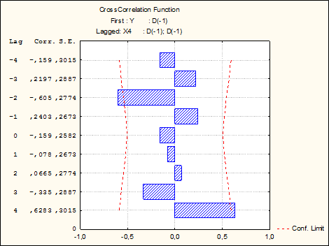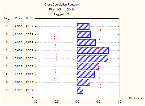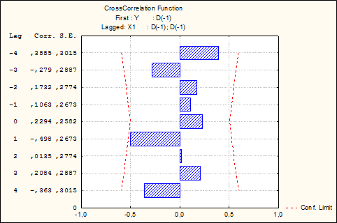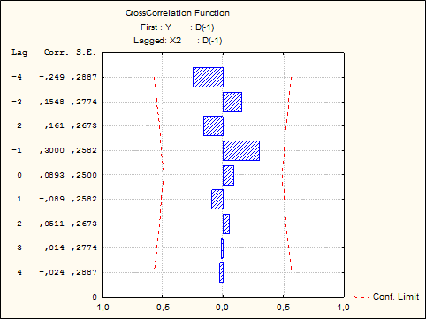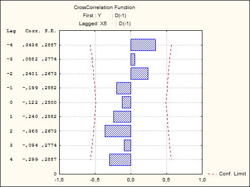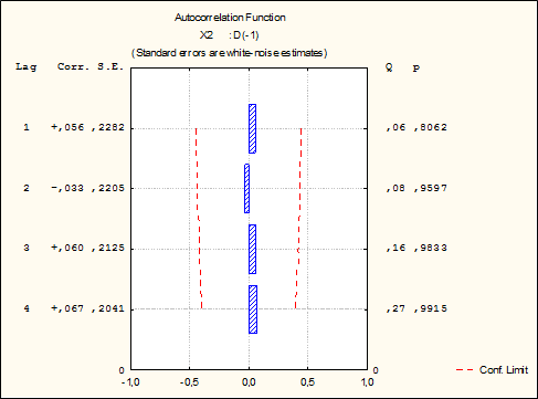 Из данного графика можно сделать вывод о том, что математическое ожидание остаточной компоненты равно нулю, т.к. линия математического ожидания находится на нулевом уровне, и остатки независимы с объясняющей переменной, т.к. коэф.корреляции=0. Следовательно, 1 и 4 условия Гаусса-Маркова выполняются.