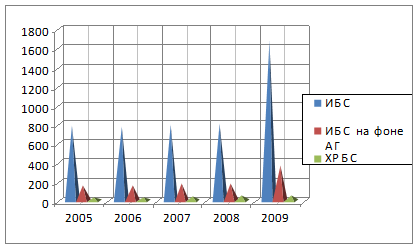 Как мы видим из таблицы и диаграммы, значительно увеличилось количество пациентов с ишемической болезнью сердца (с 84 пациентов в 2008 году до 165 пациентов в 2009 году) и количество койко-дней, проведенных этими больными (с 803 койко-дней в 2008 году до 1670 койко-дней в 2009 году). Количество пациентов с ХРБС остается на приблизительно одном уровне, что свидетельствует о хорошей диагностике и профилактики острой ревматической лихорадки и ее осложнений. Доля пациентов, страдающих ишемической болезнью сердца, также увеличилась с 59 в 2005 году до 131 в 2009 году.