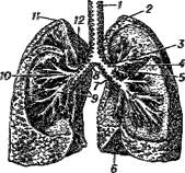 Рисунок 3. Бронхиальная система взрослого человека. Вид сзади: 1 — дыхательное горло; 2 — верхушка правого лёгкого; 3 — бронхи верхней доли; 4 — правый бронх; 5 — бронхи средней доли; 6 — основание лёгкого; 7 — бронхи нижней доли; 8 — левый бронх; 9 — бронхи нижней части нижней доли; 10 — бронхи верхней части нижней доли; 11 — верхушка левого лёгкого; 12 — бронх верхней доли.