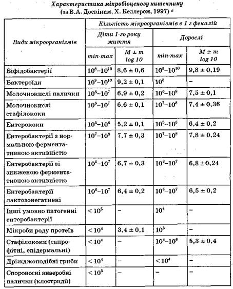 Нормальна кишкова мікрофлора виконує такі головні функції: захисну, імунну, метаболічну, сприяє остаточному перетравленню їжі, синтезу вітамінів і ферментів тощо. Склад її залежить (від віку дитини та виду вигодовування. У новонародженого кишки стерильні, але вже на 1-шу добу життя вони заселяються кишковою Паличкою, ентерококом, дріжджовою флорою, рідше стрептококом. При природному вигодовуванні в кишках переважають В. bifidus, Ш, laktisaerogenes, при штучному — В. colli.