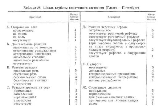 Для оценки глубины комы любой этиологии может быть использована шкала Глазго — Питтсбург (табл.28).