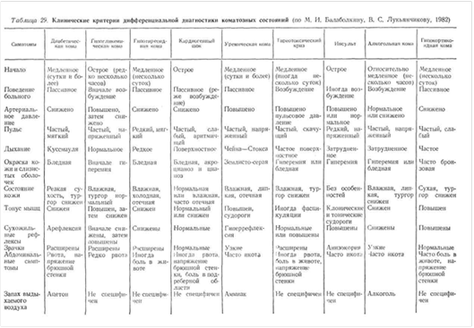 Дифференциальная диагностика ком нередко затруднена из-за отсутствия сознания. Характерные дифференциально-диагностические признаки некоторых заболеваний, приводящих к коматозным состояниям, представлены в табл. 29.