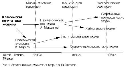 Во 2-ой половине 19 в. путь развития экономических идей раздвоился (рис. 1). Анализом социальных проблем экономики занимались в основном последователи марксистской политической экономии (с 20 в. – также и институционализма). Изучение же собственно механизма функционирования рыночного хозяйства стало прерогативой сторонников неоклассической экономической теории (неоклассики). Оба эти направления вышли из классической политэкономии, но если сторонники первого направления подвергли критическому пересмотру принципы рационального эгоизма и «невидимой руки» рынка, то сторонники второго, напротив, продолжали считать их основой подлинно научного анализа.