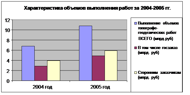 Как видно из приведенных данных за счет средств республиканского бюджета в 2004 году выполнено работ на сумму 2,9 млрд. рублей, или 43% от общего объема работ, в 2005 году выполнено работ на сумму 4,9 млрд. рублей, или 45% от общего объема работ . За счет средств других заказчиков в 2004 году выполнено по договорам прикладных топографо-геодезических и картографических работ на сумму 3,9 млрд. рублей, в 2005 году – 5,9 млрд. рублей.