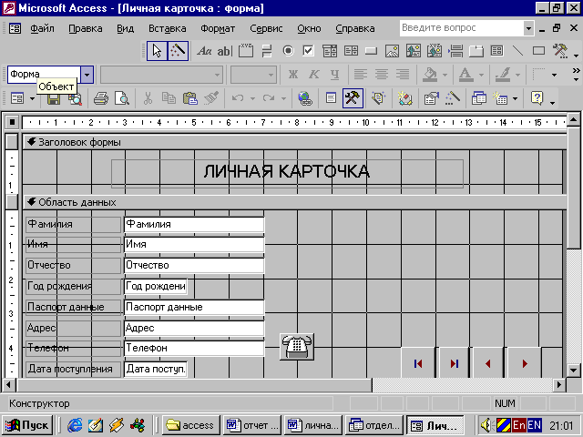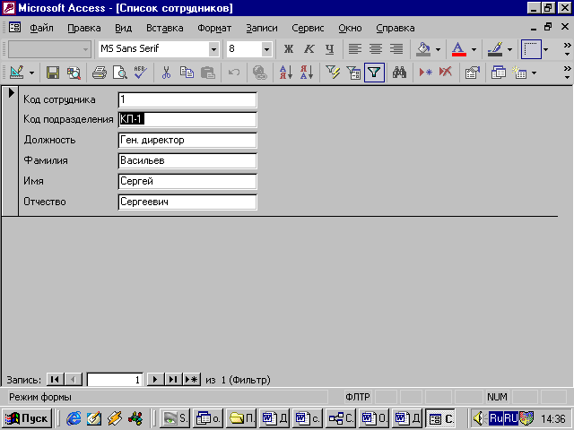 Для удобства работы и наглядности вводимых данных в базе данных создадим форму для просмотра и редактирования списка сотрудников сгруппированных по подразделениям с целью получения оперативной информации о сотрудниках, должностях и т.д. Это позволяет работнику отдела кадров вводить, редактировать и изменять данную информацию