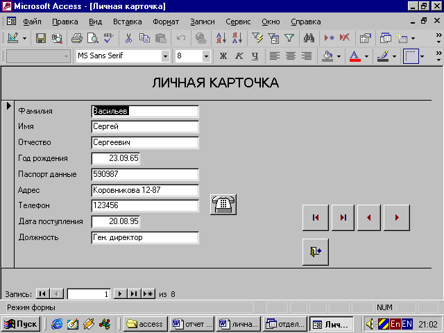 В результате проделанной работы мы создали базу данных по автоматизации учета кадров предприятия, позволяющую выполнять необходимые задачи и функции, связанные с обработкой данных по количеству сотрудников, фонду заработной платы, подразделениям и т.д. На основе исходных таблиц создали следующие выходные документы: форма для редактирования списка сотрудников отчет налоговых льгот и иждивенцев.