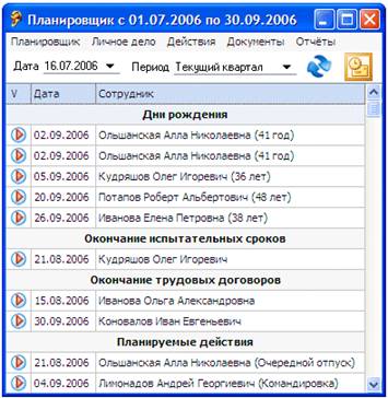 Завдяки функції планування кадрових операцій Фараон допоможе вам складати графіки навчання співробітників, чергових відпусток, атестацій і т.п. При цьому вбудований у Фараон Планувальник робочого часу нагадуватиме вам про заплановані операції, дні народження співробітників, закінченні випробувальних термінів і термінів трудових договорів (Рис 1.3). При необхідності виконується синхронізація Фараона з Календарем в Microsoft Outlook.
