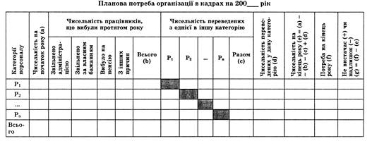 Планування підготовки починається зі складання таблиці, яка фіксує рух усіх категорій працівників протягом планового року (табл.. 2.1). Зміни, які варто планувати, заповнюють в останньому її стовпчику. Дані таблиці дають змогу визначити орієнтовну потребу в кадрах кожної категорії працівників. Однак така потреба є узагальненою, не узгодженою з обсягами робіт, зі структурними змінами в організації. Тому на наступному етапі розраховують планову чисельність таких категорій працівників: робітники; ІТП; фахівці управління (у розрізі спеціальностей); інші працівники управління; функціональні керівники; лінійні керівники.