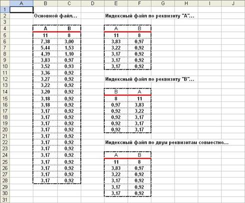 состоящий из 25 записей. Создайте индексные файлы по реквизитам А и В и двум реквизитам совместно. Необходимые дополнительные параметры выберите самостоятельно.