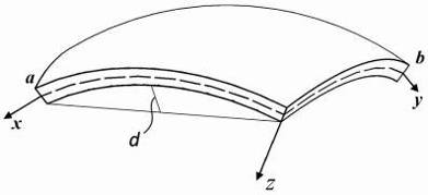 Поверхность такого вида называют поверхностью переноса. Оболочка называется пологой, если отношение стрелы подъема оболочки к наименьшему линейному размеру удовлетворяет соотношению (рис.1). Так как стрела подъема пологой оболочки мала , то геометрия пологой оболочки близка к геометрии пластины, поэтому параметры Ляме приближенно принимаются равными единице: