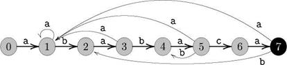 Здесь 0 — исходное состояние, 7 — единственное допускающее состояние (зачернено). Если из вершины i в вершину j ведет стрелка, помеченная буквой а, то это означает, что (i,a) = j. Отметим, что переходы, для которых (i,a) = 0, на графе переходов для его упрощения не обозначены. Жирные стрелки, идущие слева направо, соответствуют успешным этапам поиска подстроки Р — следующий входной символ совпадает с очередным символом образца. Стрелки, идущие справа налево, соответствуют неудачам — следующий входной символ отличается от очередного символа образца.