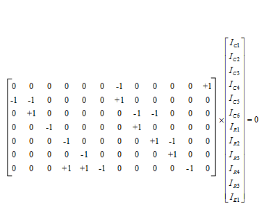 - в виде системы уравнений, которая получена из матричной формы умножением вектора-столбца токов ветвей схемы на матрицу «узел-ветвь»: