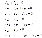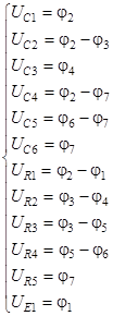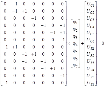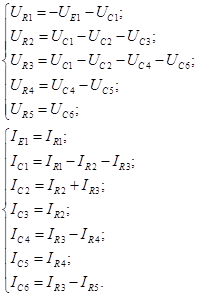 Таким образом, модель топологии заданной схемы получена с использованием метода узловых потенциалов в виде двух систем уравнений - по закону токов Кирхгофа и по закону напряжений через узловые потенциалы.