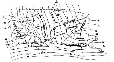 Рис. 1. Загальнозливна схема водовідведення: РНС – районна насосна станція; ГНС – головна насосна станція; ОС – очисні споруди; ПП – промислове підприємство: 1 – границя міста; 2 – зовнішня (зовнішня) водовідвідна мережа трубопроводів; 3 – ливньовипуски; 4 – дюкер; 5 – напірні трубопроводи; 6 – випуск очищених стічних вод; 7 – лінії вододілів