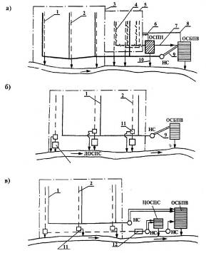 Рис. 2. Повна роздільна система водовідведення: а – без очищення поверхневого стоку; б і в-з очищенням поверхневого стоку відповідно на локальних і централізованих очисних спорудах; 1 – побутова мережа; 2 – зливна мережа; 3 – межа міста; 4 – виробнича мережа; 5 – межа промислового підприємства; 6 – повернення води на виробництво після очищення; 7 – подача води для доочищення на очисні споруди міста; 8 – подача очищених вод на промислове підприємство; 9 – напірні трубопроводи; 10 – випуск очищених виробничих стічних вод у водойму; 11 – розділові камери; 12 – регулюючий резервуар