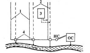 Рис. 3. Напівроздільна система водовідведення: 1 – виробничо-побутова мережа; 2 – зливна мережа; 3 – промислове підприємство; 4 – роздільні камери