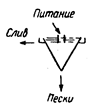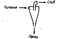 Конусный классификатор, (рис. 1). Классификаторы конусного типа — одни из старейших и недорогих аппаратов, которые все еще применяются для сравнительно грубого разделения. Они имеют большую высоту (наклон сторон равен 60°), но настолько просты, что их можно изготовить на месте. Такие классификаторы не подходят для пульп, твердые частицы которых склонны к зависанию или образованию шлама. Эксплуатация этих аппаратов часто более сложна, чем некоторых классификаторов механического типа. Гидроциклон (рис. 2). Аппараты такого типа получили очень быстрое распространение.
