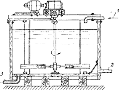 Усреднение в разервуарах-усреднителях достигают принудительным перемешиванием вновь поступающей сточной жидкости с содержанием резервуара. Перемешивание происходит из-за усиленной струйности потока, создаваемой путем устройства перегородок в резервуаре или механизированными мешалками (рис. 1); вместо мешалок нередко используется сжатый воздух.