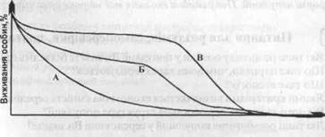 Криву виживання можна отримати, якщо розпочати з певної популяції новонароджених особин і на майбутнє відмічати число або відсоток особин, які залишаються жити в залежності від часу. Більшість тварин та рослин старіють, яке в першу чергу проявляється у зменшенні кількості особин після досягнення репродуктивного періоду, (рис. 3). Причинами цього явища є велика кількість факторів, але, як правило, в пост-репродуктивний період організм поступово втрачає свою захисну здатність. Крива А - характерна для видів, де смертність є більш менш сталою одиницею у всі періоди розвитку. Для більшості безхребетних є типовою така крива. Щось подібне було отримано для „популяції" чашок в кафетерії.