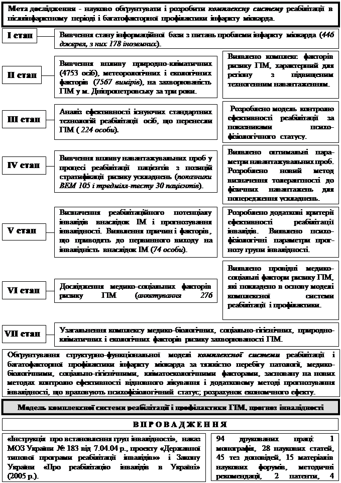- наукове обґрунтування, розробка та впровадження моделі багатофакторної системи реабілітації, прогнозування інвалідності і комплексної профілактики інфаркту міокарда з визначенням її ефективності.