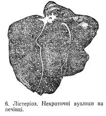 При розтині загиблих від лістеріозу кролів на печінці і рідше на селезінці спостерігають множинні білого кольору точкові ураження — некротичні вузлики (рис. 6). Селезінка збільшена, темно-вишневого кольору. Печінка набрякла( дряблої консистенції, глинястого кольору. Шлунково-кишковий тракт у стані гострокатарального або геморагічного запалення. Характерні зміни знаходять у матці. Вона збільшена, при розрізі слизова оболонка її набрякла, вкрита слизом і гноєм. У вагітних виявляють муміфіковані плоди або плоди, що гниють. Матка дуже гіперемійована, збільшена, в її порожнині скупчується гній з іхорозним запахом.