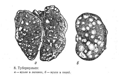 При легеневій формі у легенях виявляють велику кількість білувато-сірих вузликів завбільшки від просини до горошини й ущільнені темні ділянки (рис. 8). Часто аналогічні вузлики виявляють на плеврі і діафрагмі.