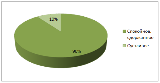 90% (9 человек из 10) анкетируемых характеризует свое поведение во время беседы при госпитализации пациентов в стационар как спокойное, сдержанное, корректное. Лишь 1 человек (10%) считает, что ведет себя неуверенно (суетливо) – это новый сотрудник отделения, стаж которого насчитывает менее года (см.рис.1)