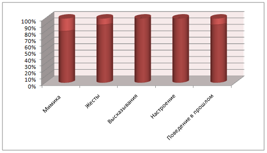 Для определения степени агрессивности пациентов медицинский персонал оценивает в их поведении: мимику – 80%, жесты – 90%, высказывания и настроение больных – 100%. Также медицинский персонал учитывает поведение пациентов во время предыдущих госпитализаций – 90% (см. рис.2).