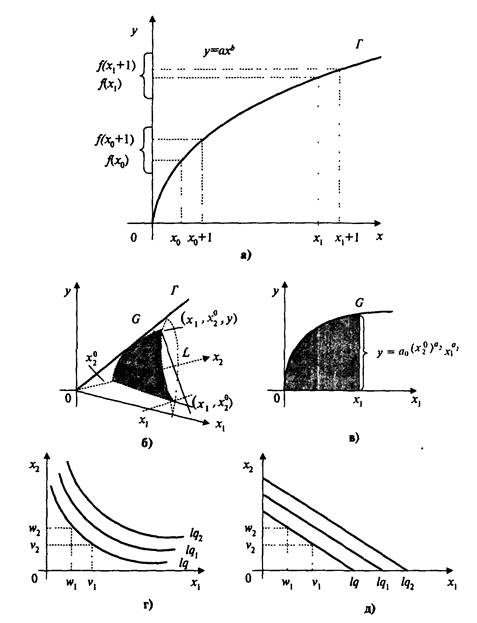 г) производственная функция является однородной функцией степени р > 0: при р > I с ростом масштаба производства в г раз (t > 1) объем выпуска возрастает в tP раз (т. е. имеем рост эффективности производства при росте масштаба производства); при р < I имеем падение эффективности производства от роста масштаба производства; при р-\— постоянную эффективность производства при росте его масштаба или независимость удельного выпуска от масштаба производства.