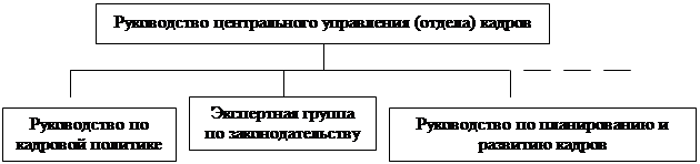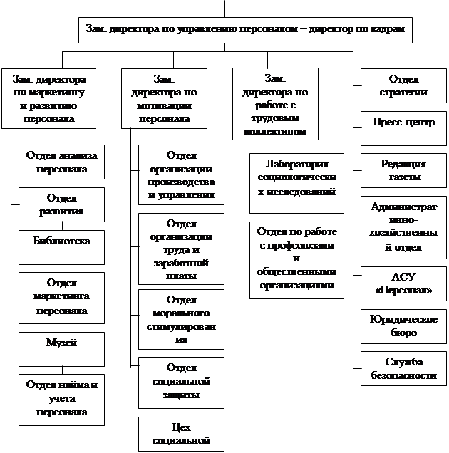 На ряде организаций формируются функциональные структуры управления персоналом, объединяющие под единым руководством заместителя директора по управлению персоналом все подразделения, имеющие отношение к работе с кадрами. В зависимости от размеров организации состав подразделений будет меняться: в крупных организациях функции каждой подсистемы обычно выполняет отдельное подразделение, а в небольших и средних организациях функции всех подсистем, как правило, сосредоточены в одном подразделении – отделе управления персоналом.