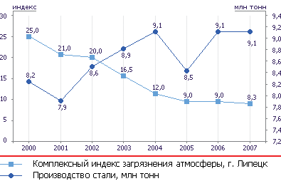 Несмотря на увеличение объемов производства продукции, уровень негативного воздействия на окружающую среду систематически снижается. В рамках 1 этапа Программы технического перевооружения удалось добиться устойчивой положительной динамики по улучшению экологической ситуации в районе размещения основного производства. Комплексный индекс загрязнения атмосферы г. Липецка по данным регионального центра Росгидромета снизился в 3 раза: с 25 единиц в 2000 году до 8,3 в 2007 году.