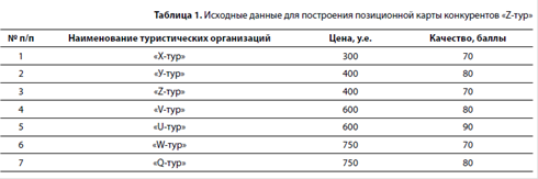Конкурирующие между собой туристические организации различаются качеством предоставляемых услуг в организуемых турах и их средней ценой. Экспертная группа определила среднее качество услуг туристических организаций по 100-бальной шкале. Средняя цена туров определялась на основе действующих в организациях цен на туры. Требуется построить позиционную карту стратегических групп конкурентов на основе исходных данных, приведенных в табл. 1, и оценить положение организации «Z-тур».