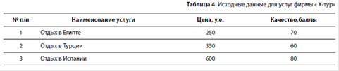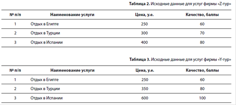 Исходные данные для построения позиционной карты конкурирующих услуг приведены в табл. 2–4.