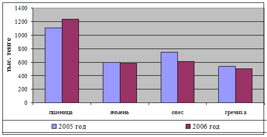 Из высше указаной таблицы видно, что объем производства в натуральном выражении имеет положительный рост по пшенице увеличение по отношению к 2005 году составило 8 тонн, но снижение произожло за счет структуры и составило 154 тыс. тенге.