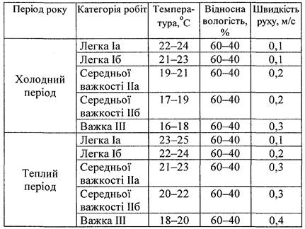 У виробничих приміщеннях періодично здійснюють мікробіологічний контроль і, за потреби, контроль повітря на вміст частинок або концентрацію відповідних речовин. Наведена нижче таблиця демонструє оптимальні величини температури, відносної вологості та швидкості руху повітря у робочій зоні виробничого приміщення: