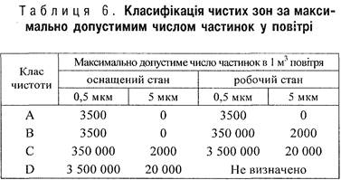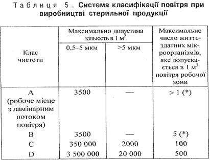 Відповідний ступінь чистоти повітря забезпечують на основі результатів валідації. Згідно з правилами належної виробничої практики Всесвітньої організації охорони здоров'я (СМР ВООЗ) чисті зони для виробництва стерильної продукції класифікують залежно від характеристик повітря на класи чистоти А, В, С і В (табл. 5).