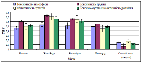 Установлено, что на территории горнопромышленных центров Днепропетровской области токсичность атмосферного воздуха, токсичность и мутагенность почв по результатам биоиндикации в 3–3,6, в8,2–11 и2,5–4 раз превышает соответствующие значения на контрольной территории, соответственно. Наибольшая токсичность атмосферного воздуха и токсико-мутагенная активность почв наблюдается на территориях городов Желтые Воды и Вольногорск, экологическая ситуация в этих городах оценена как "катастрофическая". По результатам биоиндикационных исследований экологическое состояние контрольной территории оценивается как "эталонное".