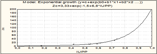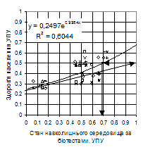 =0,604), яка може бути використана для прогнозу стану довкілля за показниками здоров'я населення у вигляді X=ln4·Yабо X=1,39+lnY. Залежність показників інтегрального здоров'я населення від інтегрального забруднення довкілля описується прогресуючою експонентою, параметри якої визначаються рівнем природної захворюваності населення в умовах навколишнього середовища, близьких до комфортних, що складає близько 25% і не залежить від забруднення, а інтенсивність росту захворюваності від забруднення близька до одиниці.