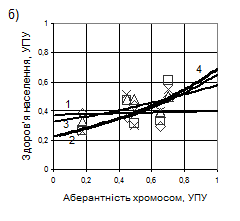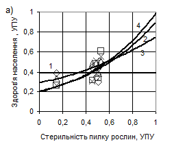Рис.5. Залежності різних показників здоров'я населення від оцінок стану довкілля за кожним з трьох запропонованих біотестів. а – Стерильність пилку рослин-фіто-індикаторів; б – Частота аберантних хромосом; в – Мітотичний індекс;