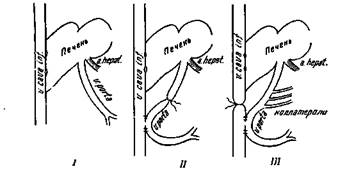 І — схема хода сосудов до операции; II — экк-павловская фистула. Наложено соустье между воротной веной и нижней полой веной; воротная вена между соустьем и печенью перевязана; ІІІ — «перевернутая» экк-павловская фистула. После наложения соустья между воротной веной и нижней полой веной последняя перевязана выше соустья — в этом случае развиваются коллатерали между v. porta n v. azygos.