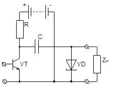 Главным требованием является минимальное количество потребляемой энергии. Ограниченность размеров ЭКС и требование высокой надежности также обусловливают необходимость минимизации числа составных частей прибора, поскольку он состоит из дискретных элементов. Однако при использовании гибридных или монокристаллических интегральных схем сложность электронных цепей не оказывает решающего влияния на размеры ЭКС. Электрокардиостимулятор состоит из нескольких функциональных блоков. Наиболее простой по конструкции асинхронный прибор состоит из генератора импульсов и выходной цепи. Управляемый ЭКС кроме генератора импульсов и выходной цепи содержит еще усилитель биопотенциалов и цепи управления. Обычная схема выходной цепи ЭКС показана на рис. 3.26. После отпирания транзистора VT заряженный конденсатор С разряжается через полное сопротивление ткани Z. В промежутке между импульсами конденсатор заряжается от источника E через сопротивление R. Полное сопротивление ткани Z содержит как активную, так и емкостную составляющую и имеет нелинейный характер. У электродов с площадью около 30 мм2