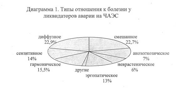 На третьем месте - эргопатическое отношение к болезням, которое демонстрируют 13% ликвидаторов аварии на ЧАЭС. Пытаясь "убежать" от болезни, ликвидаторы аварии преуменьшают ее значение, вплоть до вытеснения, отрицания факта заболевания и ухода в другие виды деятельности. Следствием такого "бегства" является реальная потеря различных льгот, положенных ликвидаторам по закону. Как подчеркивал Б.Д. Карвасарский, "одним из важнейших показателей личностной адаптированности служит адекватность намеченных целей возможности их реализации в заданных условиях". Понятно, что группа инвалидности для этих пациентов выступает как своеобразный "допуск" к серьезной материальной компенсации участия в ликвидации аварии на ЧАЭС. Для большинства пациентов, возможность получать государственную компенсацию - единственный источник доходов. С другой стороны, средний возраст ликвидаторов предполагает активность в разных видах деятельности, в том числе и профессиональной, общественной, семейной и пр. Поэтому они оказываются перед дилеммой: либо демонстрировать клиническую симптоматику своего заболевания, на основании которой определена группа, либо оставаться здоровыми мужчинами.