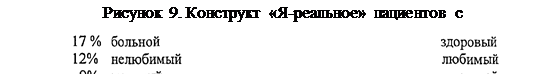 Обращает внимание набор характеристик, имеющих самые высокие факторные нагрузки по показателю «Я-реальное» у данной группы пациентов, четко диагностируемый как неосознаваемое ожидание катастрофы. Распределение характеристик на оси конструкта «Я-реальное» ассиметрично. На правом полюсе, обычно представленном противоположными характеристиками, не имеющими отношения к значимым людям, характеристики отсутствуют. Стоит отметить дистанцированность данной группы пациентов от значимых людей при выполнении методики. Так, характеристики, наиболее часто употребляемые пациентами с инфарктом миокарда и имеющие наибольшие веса в факторном анализе, крайне редко использовались относительно выбранных персонажей.
